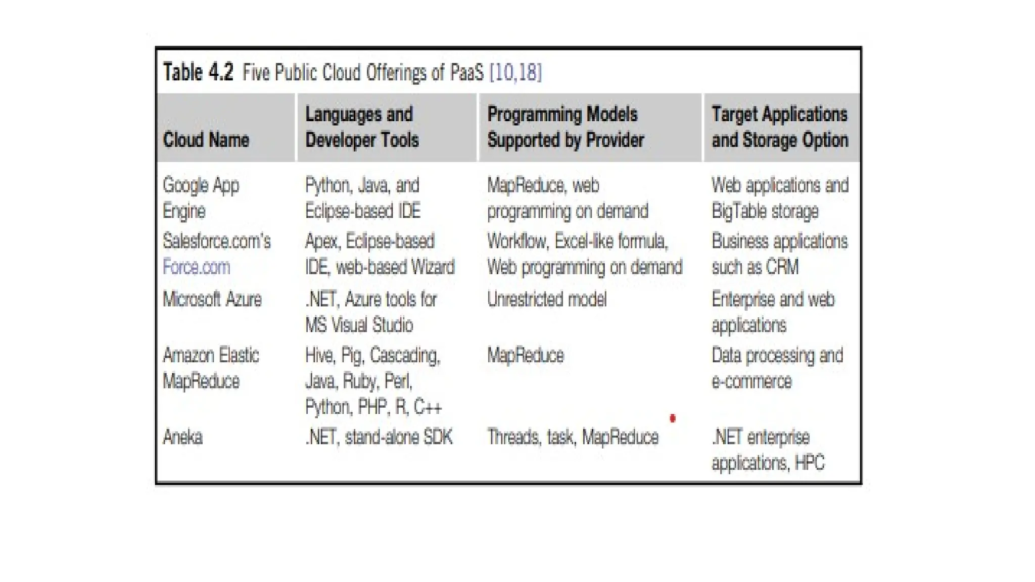 Table 4.2 highlights cloud platform services offered by five PaaS services.