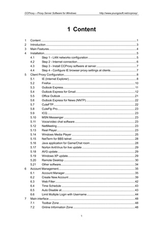 The document is a user manual for CCProxy proxy server software. It provides instructions for installing and configuring the software to share an internet connection on a local area network (LAN). CCProxy can act as an HTTP, FTP, mail, SOCKS and other protocol proxies. It includes features like account management, bandwidth control, web filtering, access logging and monitoring.
