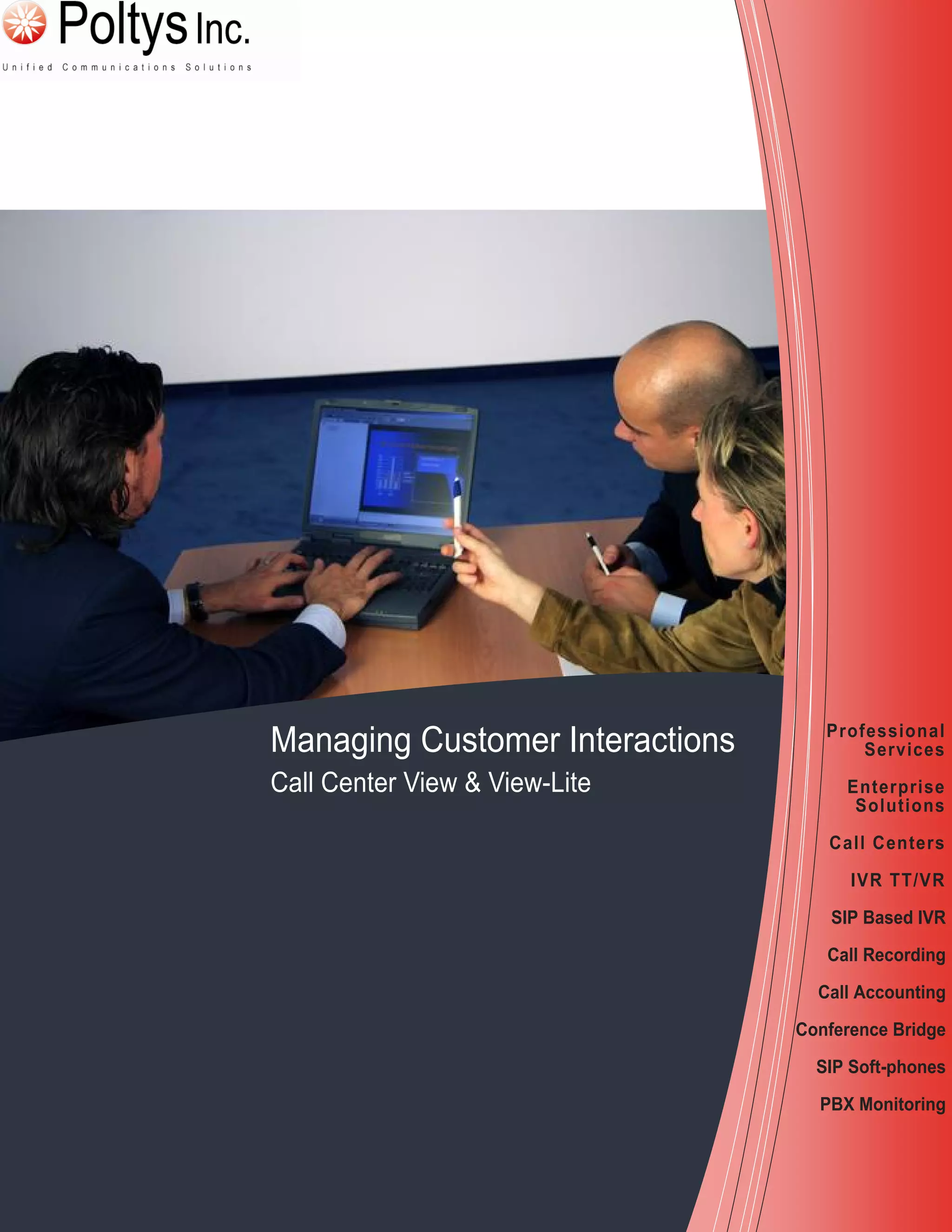 The document discusses Call Center View and View-Lite software for call centers. It summarizes that the software allows call centers to share information and add enhancements cost-efficiently using XML and SQL databases. It provides features like real-time monitoring of agent performance, historical reports, and call recording to improve customer service and reduce costs. The software includes options like integrated IVR and queue wait time announcements.