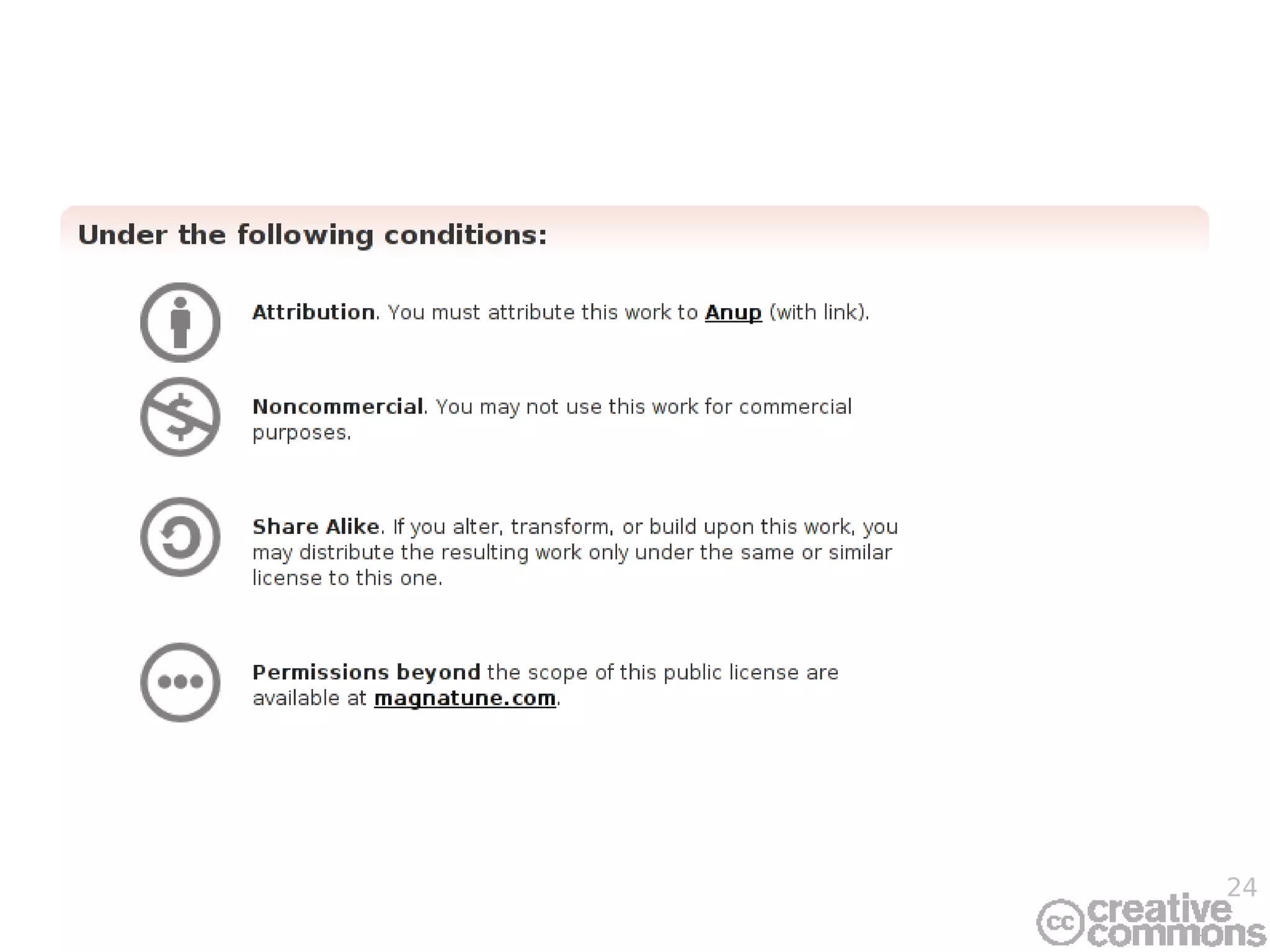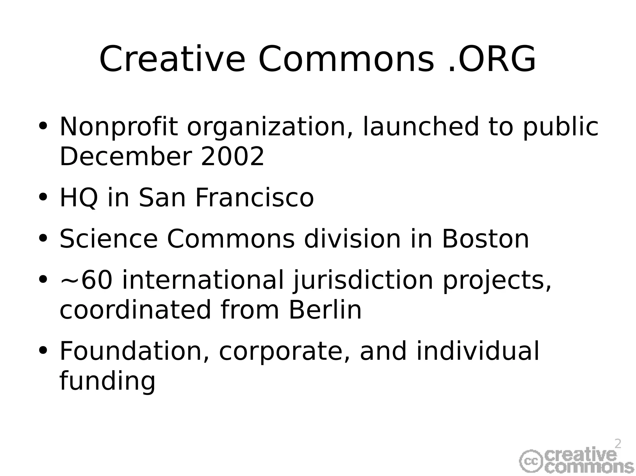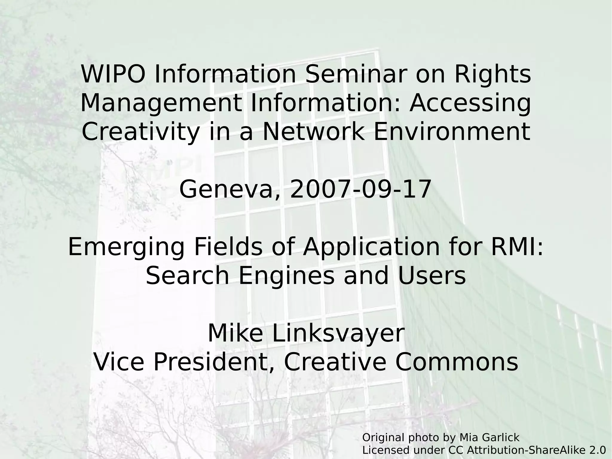 The document discusses a seminar on rights management information (RMI) and the importance of creative commons in enhancing access to creativity in a networked environment. It identifies emerging applications of RMI, highlights various licensing options, and emphasizes the need for effective management of rights and resources in digital content. The presentation also addresses the challenges of modern digital asset management and the role of metadata in facilitating better access and consumer value.