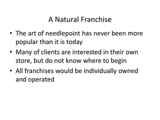 Definitely Needlepoint is a franchise opportunity in the growing art of needlepoint. Many clients are interested in owning their own needlepoint store but don't know where to start. Definitely Needlepoint provides site selection, initial setup, inventory, marketing programs including classes and events, and a financial model. Their goal is to launch an initial franchise campaign, identify two potential franchisees for next year, and expand to ten additional franchises in their second year.