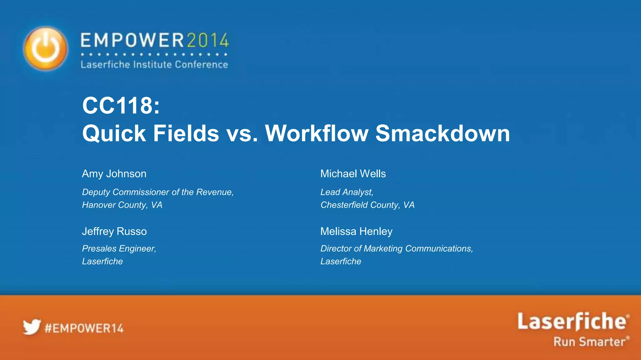 The document discusses a presentation on the use of Laserfiche Quick Fields and Workflow, comparing their benefits in various scenarios like invoice processing, reorganizing repositories, and managing new hire paperwork. It explores when to use each tool or both to optimize document handling and processing within organizations. The presenters include experts from Laserfiche and local government, and they emphasize understanding resources and best practices for efficient workflow management.