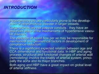 This study evaluated morphologic and functional parameters of common carotid arteries in 100 hypertensive patients divided into three age groups. Results showed a significant relationship between age and increases in carotid diameter and wall thickness. Atherosclerosis and plaque formation increased with age, particularly in those over 60. Both aging and hypertension contributed to reduced arterial distensibility and stiffness. In conclusion, aging exacerbates the effects of hypertension on the structure and function of carotid arteries.