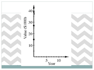The document discusses depreciation rates for three cars: a 2010 Fonda Concord EX depreciating at 6% per year, a 2010 Padillac Escalate depreciating at 22.5% per year, and a 1967 Fyord Rustang appreciating at 10% per year. It tasks the reader with generating representations of the value of each car over time and determining which car Jeralyn should buy based on value retention from 2010 to 2012.