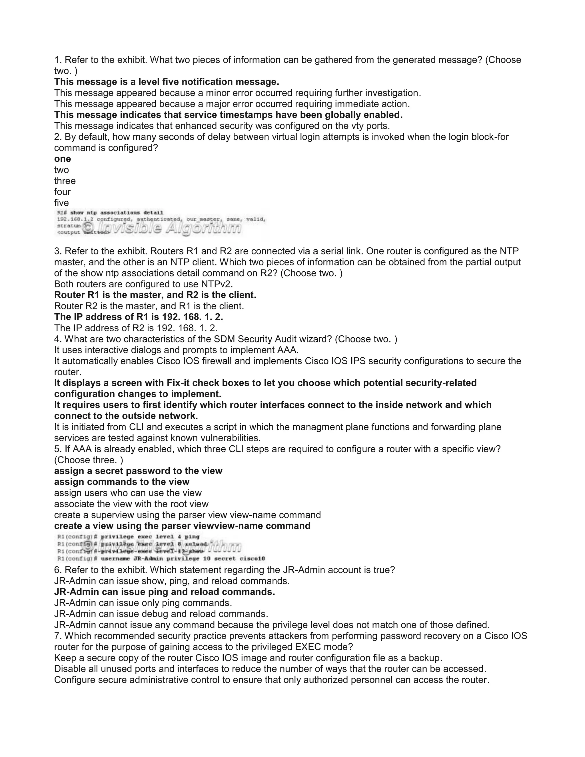 This document contains questions about router security configuration and concepts. It covers topics like AAA configuration, SSH, SNMP, SDM wizards, and Cisco IOS resilience features. The questions ask about commands, default settings, and characteristics related to securing and hardening a Cisco router.