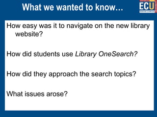 The study observed 5 first-year students using the new library website and OneSearch tool to complete searches on assigned topics. Researchers captured the students' screens, audio, and video to analyze how easily they navigated the new site, how they used OneSearch, how they approached the search topics, and what issues arose. The researchers discovered insights into how students interacted with the updated library site and search tool that could help improve the student experience and scholarly resources offered by the university library.