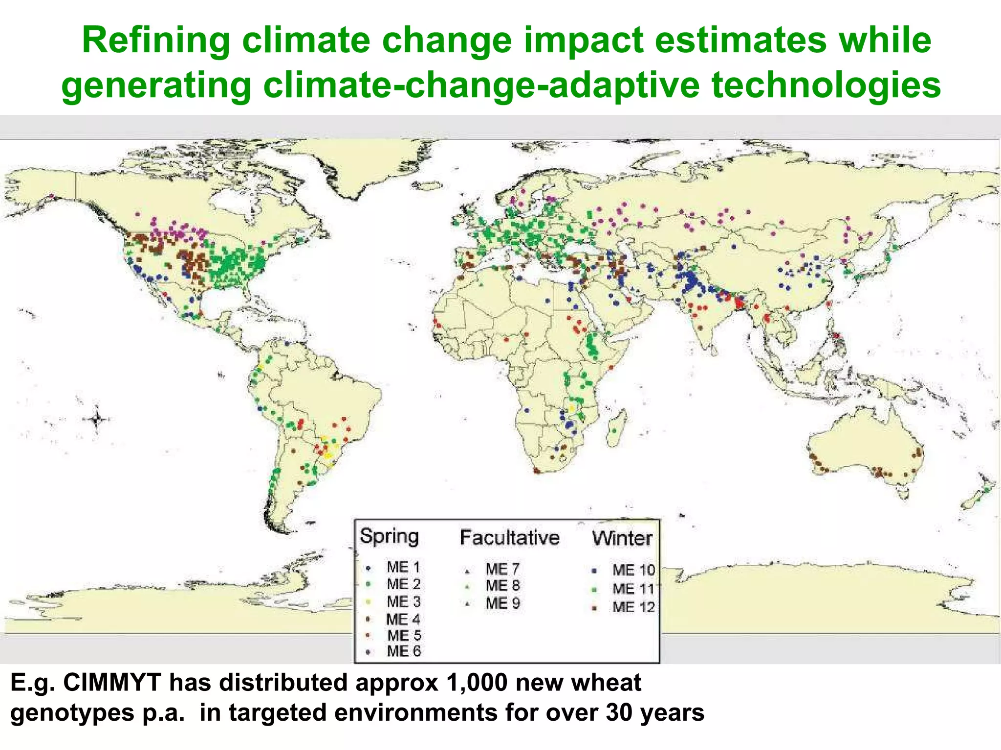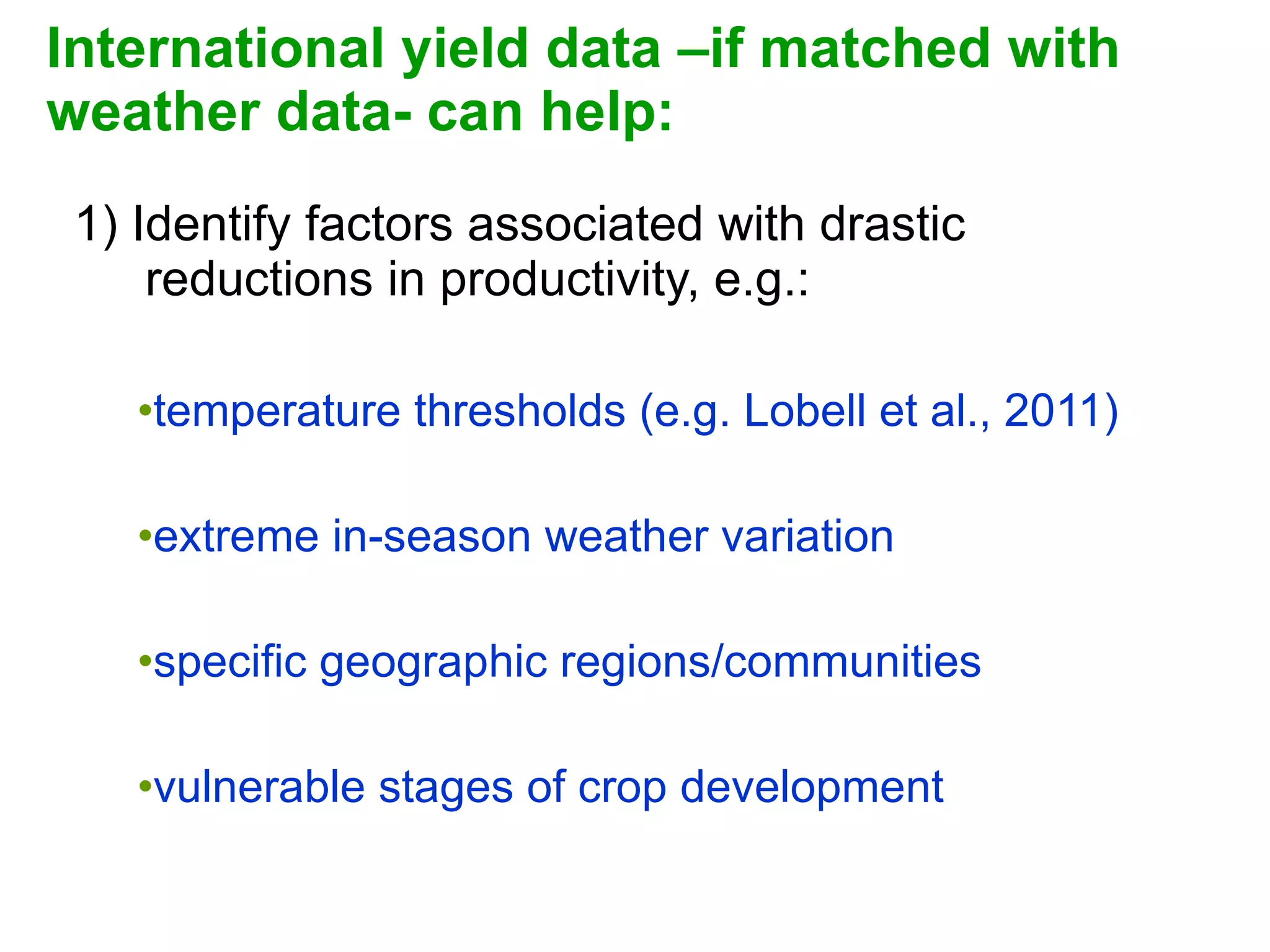 The document discusses using historical yield and weather data to help refine climate change impact estimates and develop adaptive technologies. It outlines how the data can be used to: 1) identify factors associated with reductions in productivity like temperature thresholds and vulnerable crop stages; 2) pinpoint sites for testing new technologies; and 3) integrate diverse datasets to improve crop and economic models. The goals are to deploy climate-ready technologies, identify management strategies, and prioritize crop adaptation.