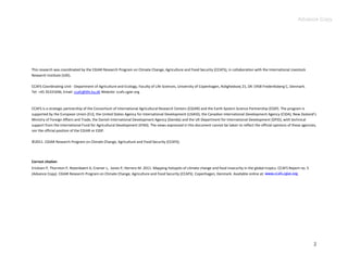 This report identifies areas vulnerable to future climate change and food insecurity in the global tropics. It analyzes maps of climate change exposure thresholds and food security indicators to identify hotspots. Nine vulnerability domains are established based on exposure, sensitivity, and coping capacity. The most vulnerable domain has high exposure, high sensitivity, and low coping capacity. This analysis finds large areas of Africa, South Asia, and parts of Central and South America fall into this highly vulnerable category for several climate change exposures. The choice of exposure indicator influences the size and location of vulnerable populations.