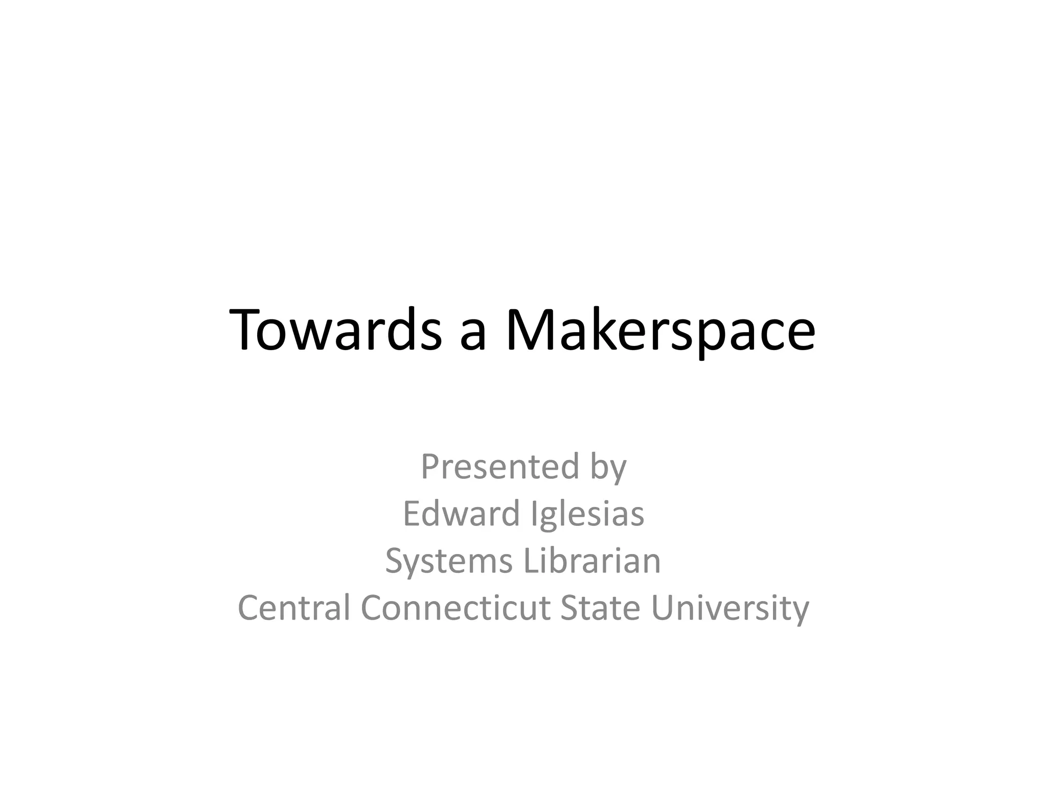 The document discusses the concept of a makerspace and proposes establishing one at the Central Connecticut State University Library. A makerspace is a community space where people can gather to work on projects using tools and expertise. The library sees a makerspace as aligning with its strategic direction of facilitating knowledge creation and inspiring learning by providing a space for students and faculty to create and collaborate on projects.