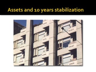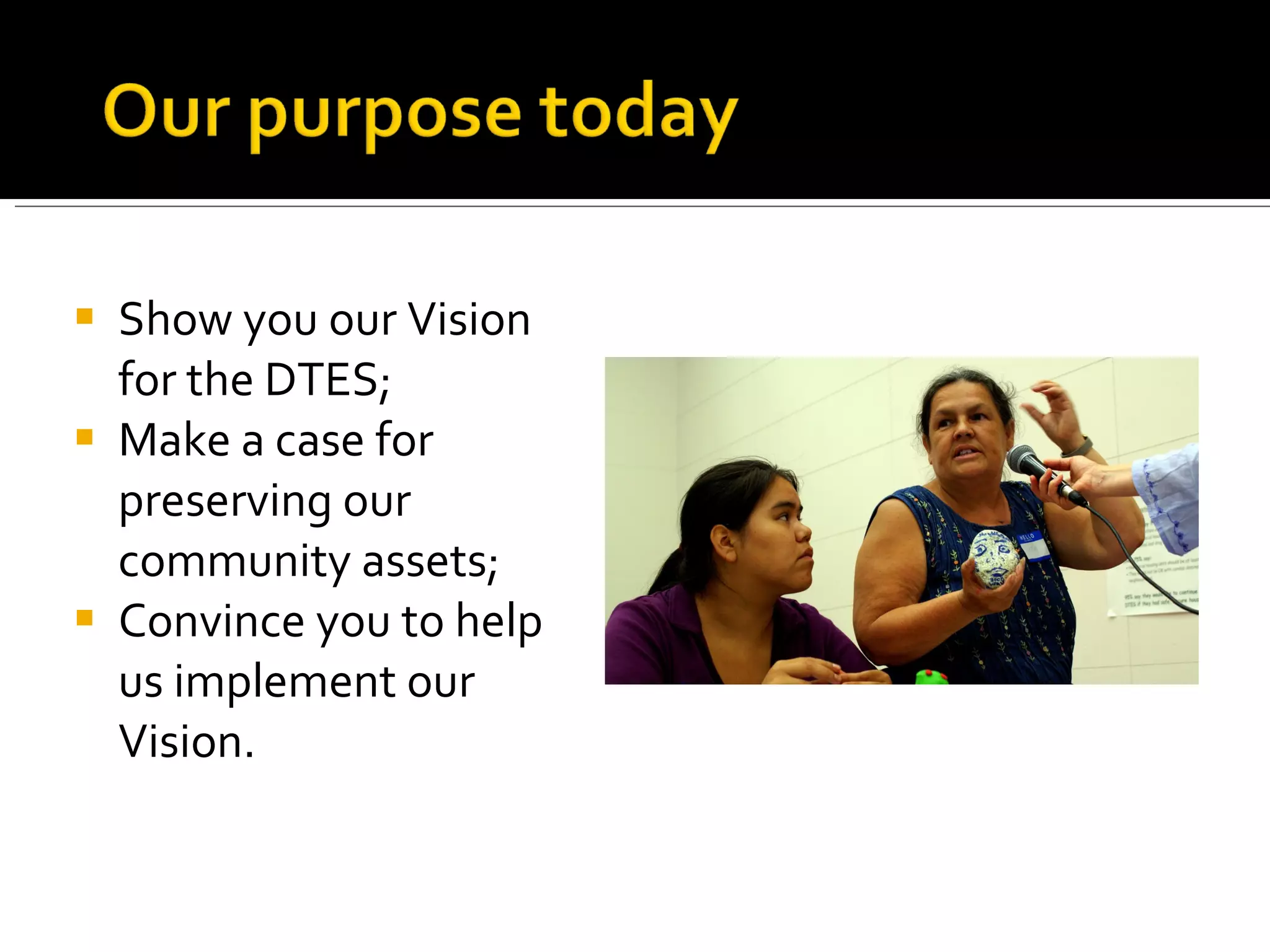 The document outlines a vision for the Downtown Eastside (DTES) community, advocating for the preservation of its assets and the implementation of a ten-year stabilization plan. It emphasizes the importance of affordable housing, community inclusion, and addressing systemic poverty while respecting the diverse heritage of the area. Additionally, it highlights the need for community-led decision-making and proposes actions to improve safety, health services, and cultural support within the DTES.