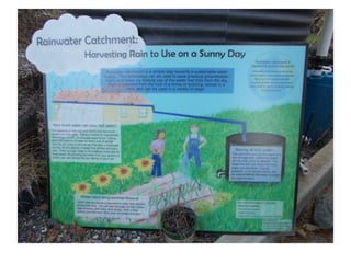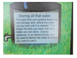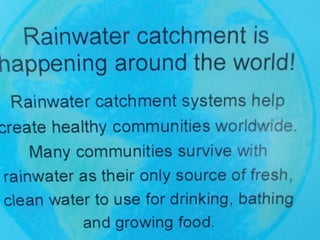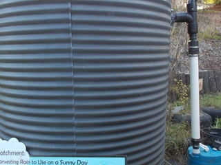 The document discusses the concept and importance of rainwater catchment systems, specifically through the example of the CCAT house on HSU campus. It describes how rainwater is harvested for various uses such as gardening and irrigation, and emphasizes the educational role of the CCAT system in promoting understanding of rainwater catchment. Additionally, it mentions the functioning of the system and the capacity of its 1500-gallon holding tank.