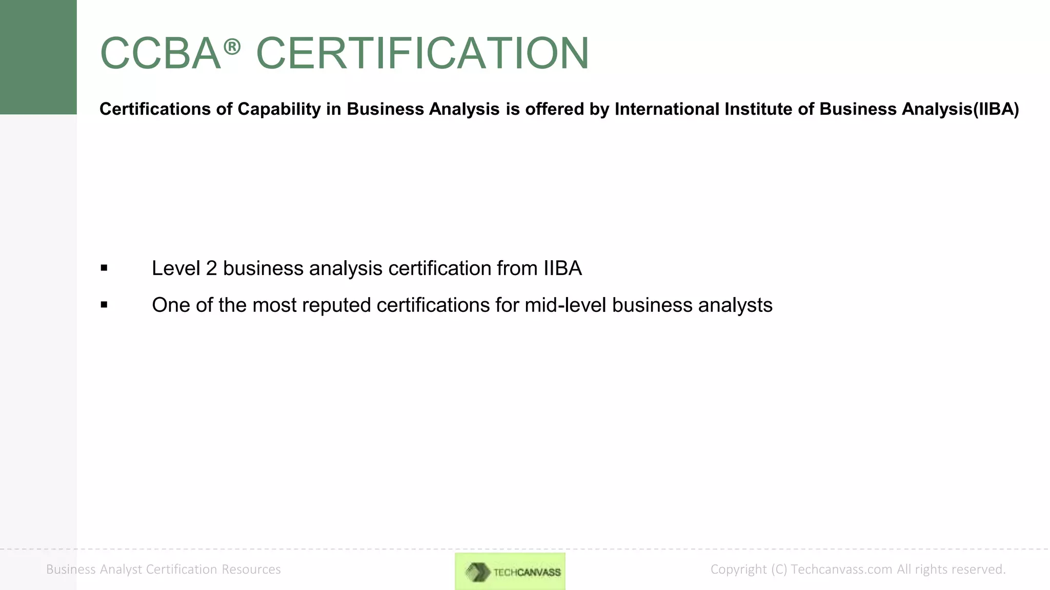 The document discusses the CCBA certification from the International Institute of Business Analysis. It is a Level 2 certification for mid-level business analysts that requires a minimum of 3,750 hours of business analysis experience over 7 years. The 130 question, 3 hour exam covers the 6 knowledge areas of the BABOK guide. Requirements for eligibility, fees, exam pattern and scoring are also outlined.