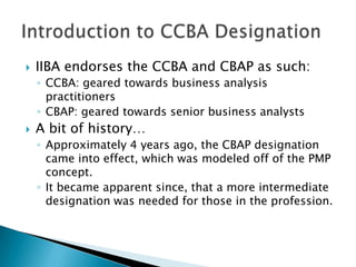 The CCBA certification is aimed at intermediate business analysts and requires 2.5 years of experience and passing an exam. It covers the same six knowledge areas as the more advanced CBAP certification. To apply for the CCBA, candidates must meet minimum experience requirements in two or four of the knowledge areas, complete 21 hours of professional development, and obtain two references. The CCBA exam is similar in structure and length to the CBAP exam, with 150 multiple choice questions to be completed within 3.5 hours. While the CCBA is a new certification, candidates are advised to use the BABOK as a study guide. The presentation also reviewed the CBAP recertification process which requires maintaining 60 continuing development units over three years