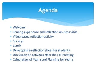 The document outlines the agenda for a meeting between the Riverside School Board and McGill University to discuss enhancing mathematics teaching and learning through technology. The agenda includes sharing reflections on classroom visits, a video-based reflection activity, developing a student reflection sheet, and discussing post-meeting activities for the upcoming year. It also provides contact details for the project leads and organizers.