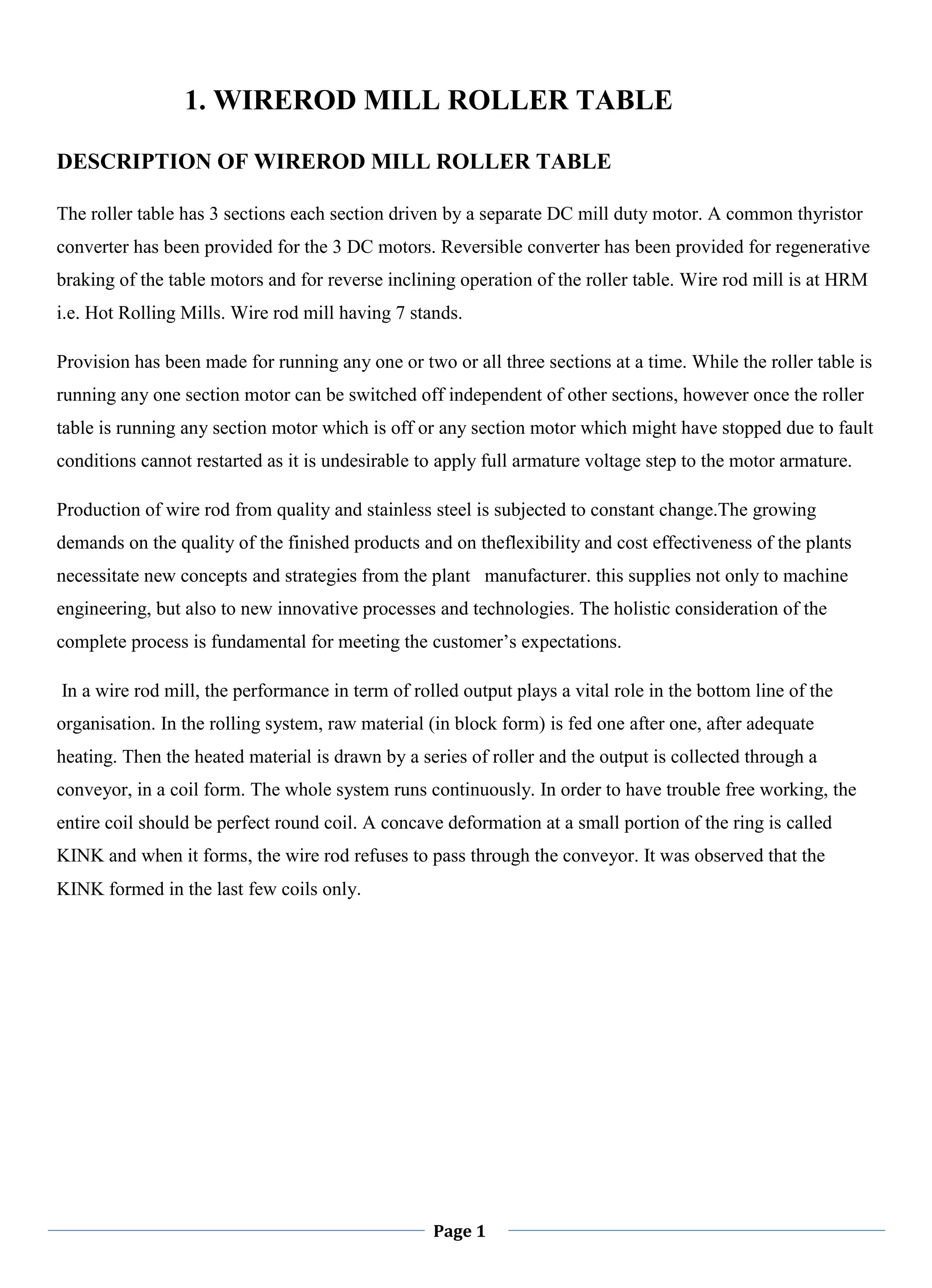 The document describes the roller table of a wire rod mill. It has 3 sections each driven by a separate DC motor powered by a common thyristor converter. Provision is made to run each section independently. The roller table experiences kinks forming in the last few coils of wire rod, negatively impacting production. DC motors are then described as consisting of a stator and rotor that use electromagnetic forces to convert electrical energy into rotational motion.