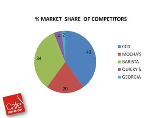 Café Coffee Day was founded in 1996 in Bangalore, India and has grown to become the largest coffee chain in India with over 1500 outlets across 28 states. It aims to provide affordable, high quality coffee experiences. While it faces significant competition from other coffee chains and substitutes, Café Coffee Day differentiates itself through its large network of cafes, strategic locations, variety of products, and consistent customer service across outlets.