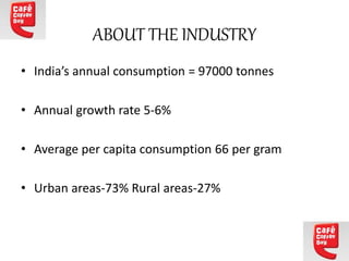 Café Coffee Day is India's largest coffee chain. It owns coffee plantations and serves coffee grown from its own farms. Café Coffee Day aims to provide an affordable yet world-class coffee experience. It has strategically located outlets near colleges, offices and other busy areas to target youth aged 15-29. Café Coffee Day pioneered the café culture in India and competes with international chains like Starbucks as well as domestic rivals like Barista. Through reasonable pricing, quality coffee, and a youthful atmosphere, Café Coffee Day has become the top coffee chain in India.