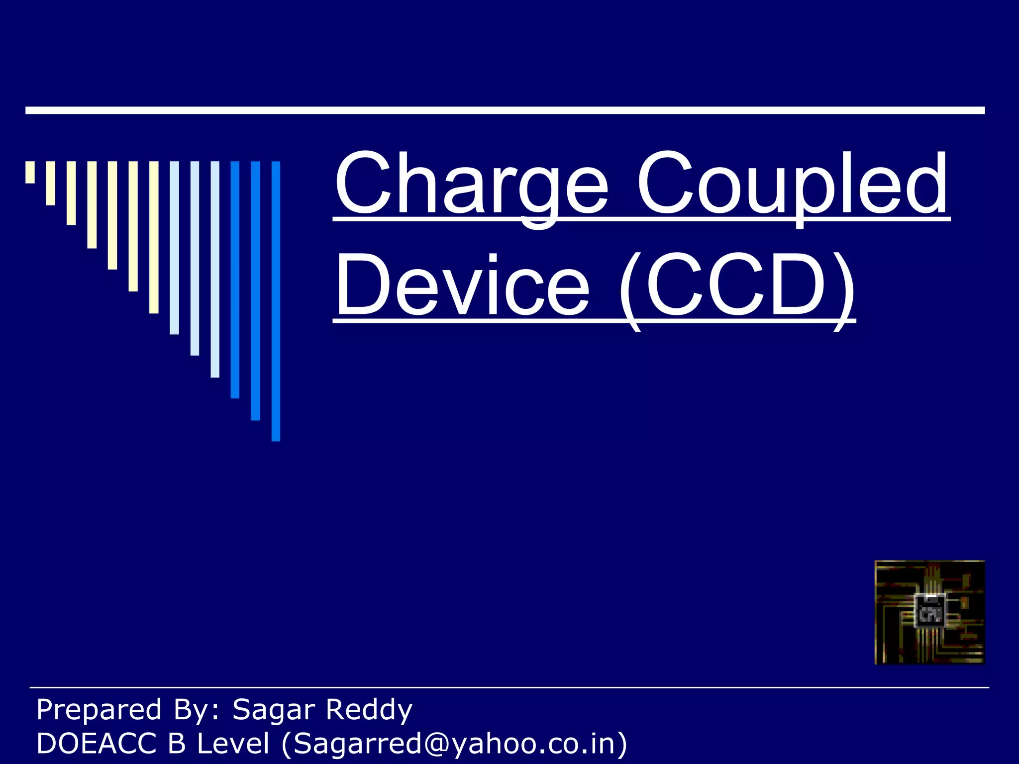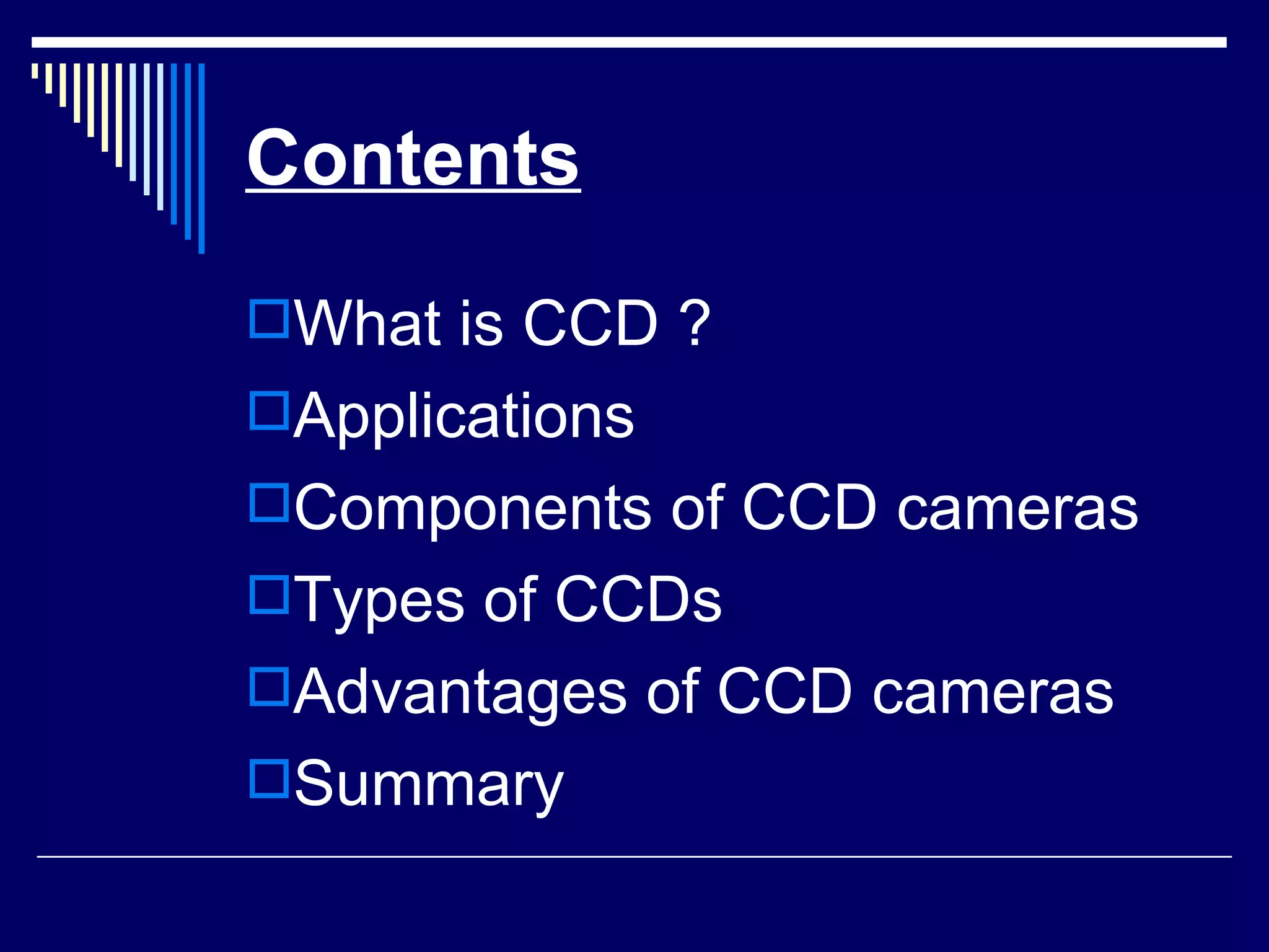 The document discusses Charge Coupled Device (CCD) cameras. It describes CCDs as light-sensitive chips made of silicon that convert light into electrical signals. CCDs are used in digital cameras, video cameras, and optical scanners. The key components of a CCD camera are the CCD chip, camera body, and electronics. When taking an image, the CCD goes through clearing, exposure, and readout phases to capture and process the light information. CCDs have advantages over film, including immediate image review, digital storage, and lack of degradation over time and copying.