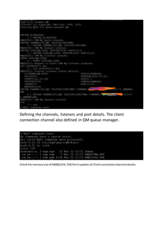 The document outlines the process for connecting one application to multiple queue managers using the Client Connection Definition Table (CCDT). It details steps such as creating and starting queue managers, defining channels and listeners, and setting up authorization and environment variables for message handling. Additionally, it includes instructions for updating the amqclchl.tab file and performing actions across different operating systems.