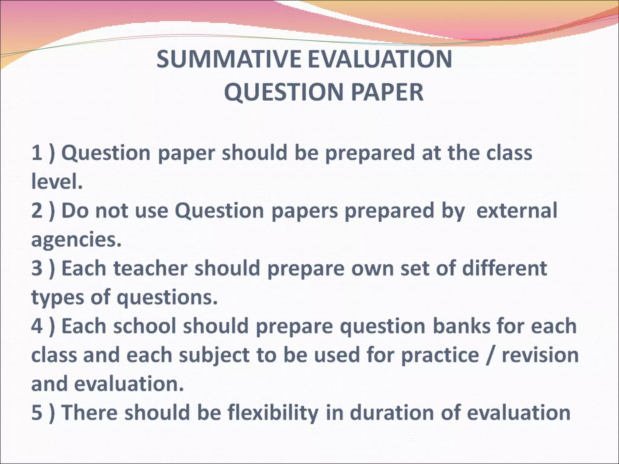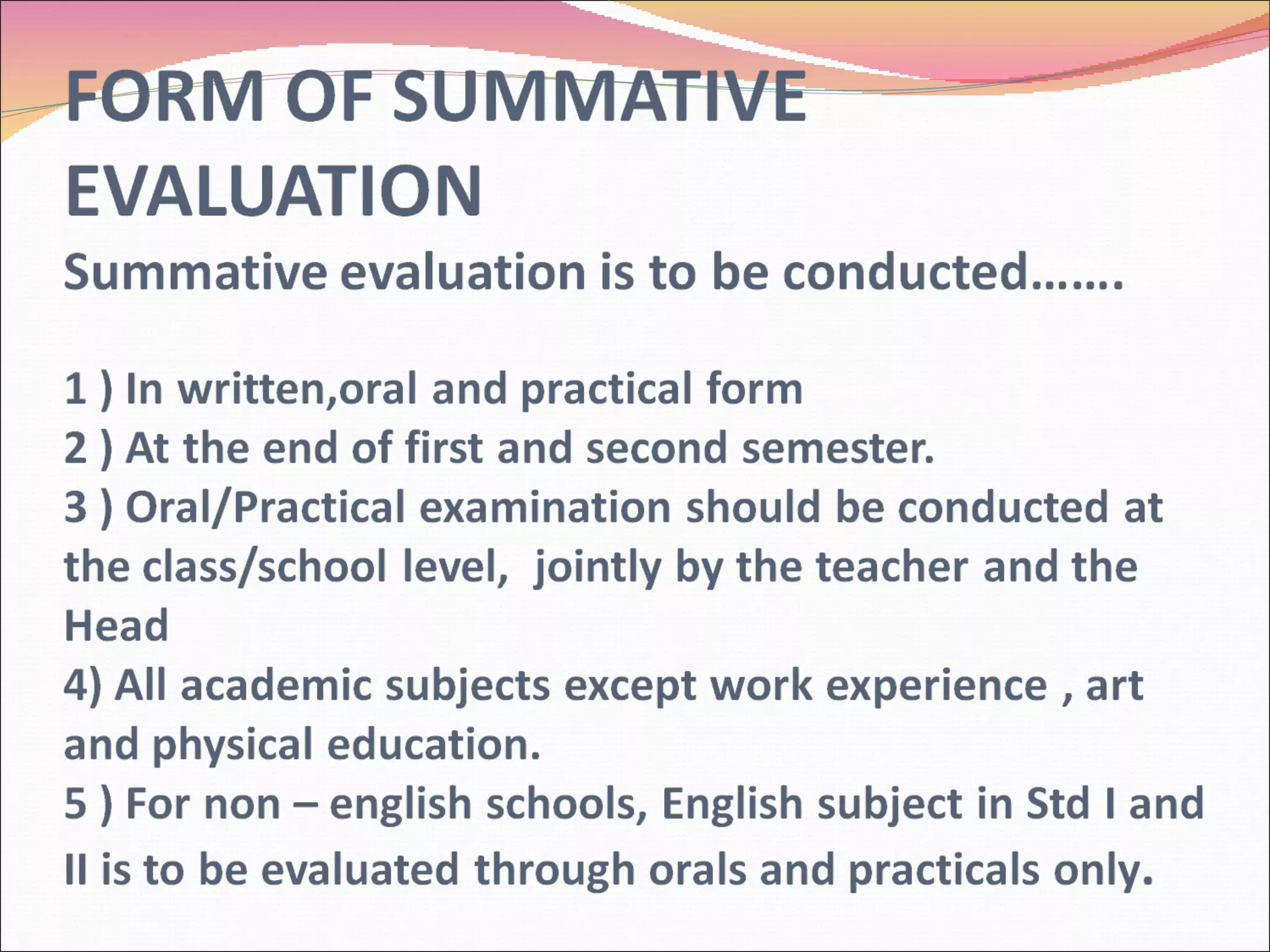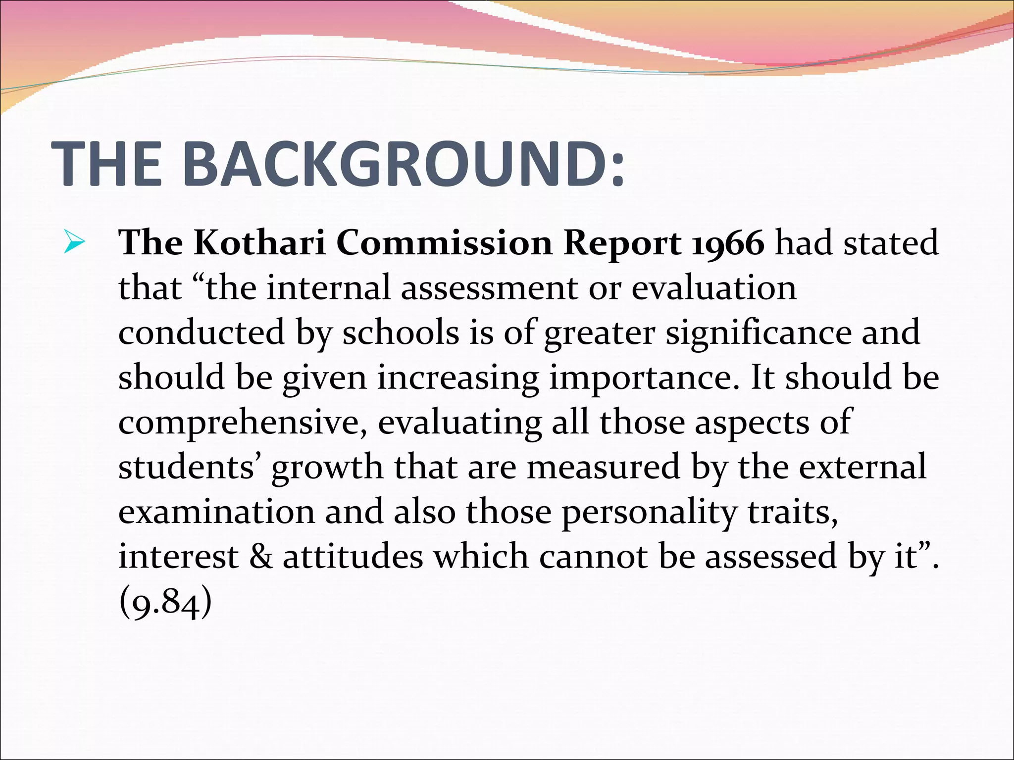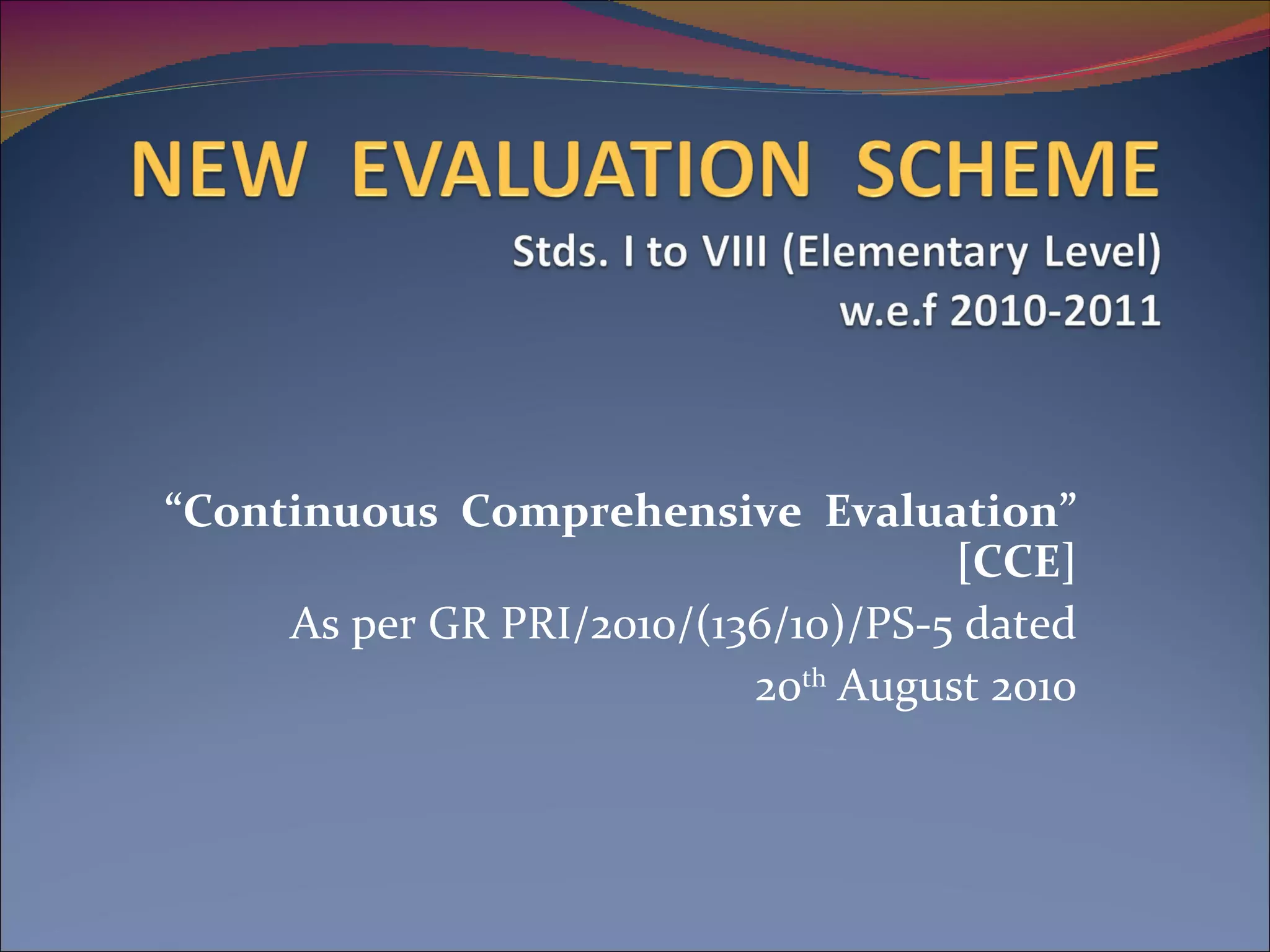 The document outlines the framework for Continuous Comprehensive Evaluation (CCE) as per Indian educational policies, emphasizing a holistic approach to assess students' scholastic and co-scholastic growth. CCE is designed to integrate ongoing assessments into the learning process, aiming to enhance skills like cognitive and emotional development while reducing stress from traditional testing methods. The document also distinguishes between formative and summative evaluations, detailing their objectives, methods, and grading criteria, while highlighting the importance of parental involvement and teacher training in implementing CCE effectively.