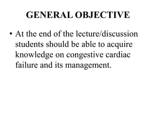 This document provides information on congestive cardiac failure, including its causes, types, signs and symptoms, and management. It begins with objectives of describing the heart's anatomy, defining congestive cardiac failure, and outlining its causes, forms, pathophysiology, and management. It then discusses the anatomy of the heart, defines congestive cardiac failure, and lists common causes such as reduced or increased blood volume, valvular disease, and conditions that increase metabolic demands. Compensatory mechanisms, types of failure, signs and symptoms, diagnostic tests, and medical treatments including diuretics and ACE inhibitors are also summarized.