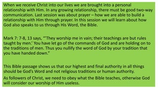 The document provides instructions for an obedience-based Bible study method. It explains that the method involves writing out Bible verses, paraphrasing them in one's own words, and making a commitment to obey what was learned by writing "I will" statements. Doing the study individually or in a group, discussion questions are used to facilitate interaction with and understanding of the Scripture passage. [END SUMMARY]