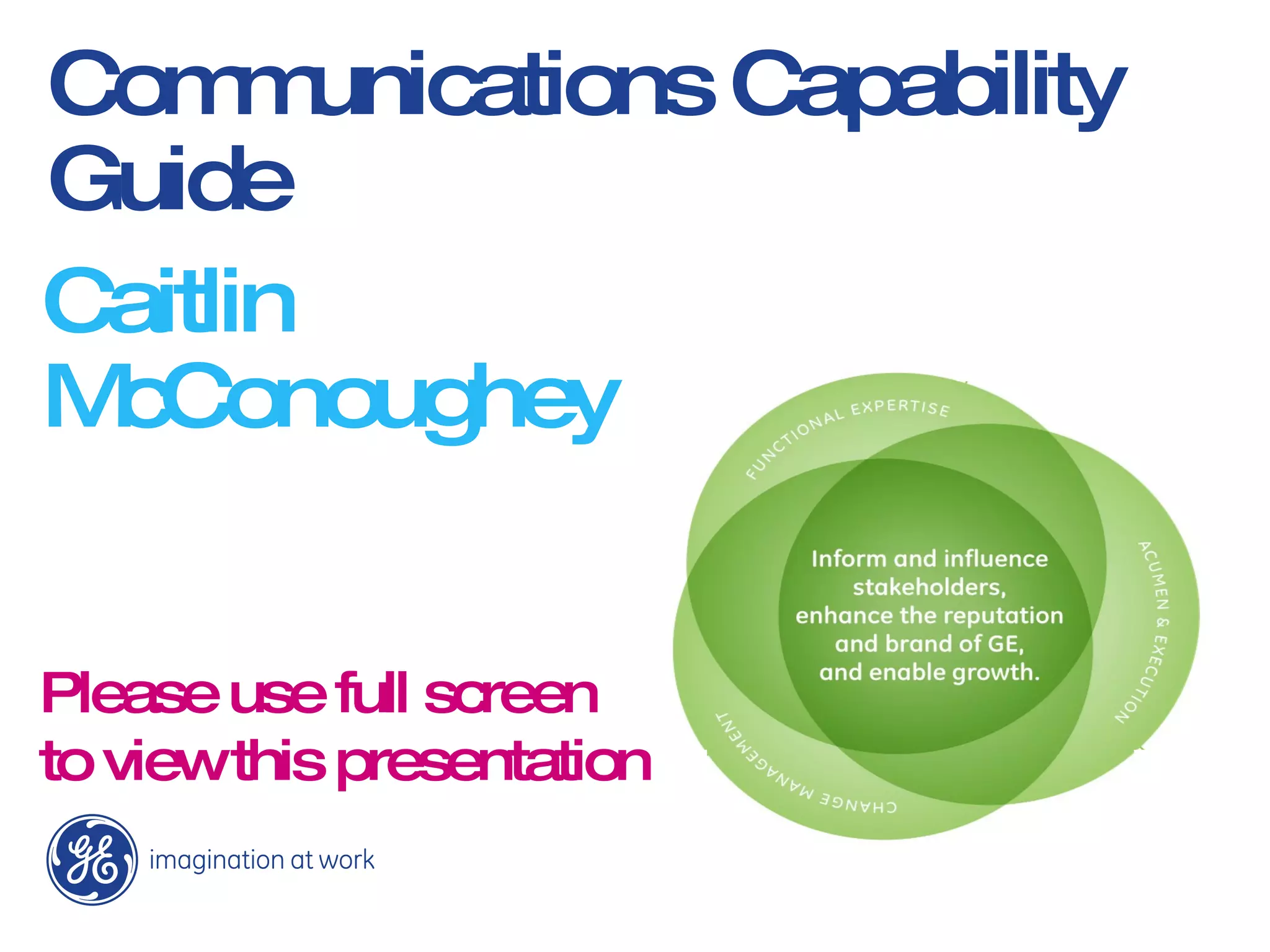 The document summarizes the development of a communications capability guide at GE. It describes creating the guide over three weeks with input from high potential communicators and experts from around the world. The guide includes 500 pieces of content, self-assessment tools, and a learning library. It covers five clusters and 17 capabilities related to communications strategy, process, organizational communications, media, and branding. The results showed increased traffic to the site and library usage. It was benchmarked against other companies and written up as an industry best practice.