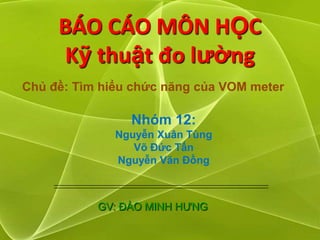 Báo cáo tìm hiểu về đồng hồ vạn năng (vom meter) trình bày lịch sử, phân loại, cấu tạo và nguyên lý hoạt động của thiết bị này. Đồng hồ vạn năng có nhiều chức năng như đo điện áp, dòng điện, điện trở, kiểm tra diode, và nhiều ứng dụng khác trong kỹ thuật. Đây là một công cụ quan trọng hỗ trợ trong đo lường các đại lượng điện trong các hệ thống điện và tự động hóa.