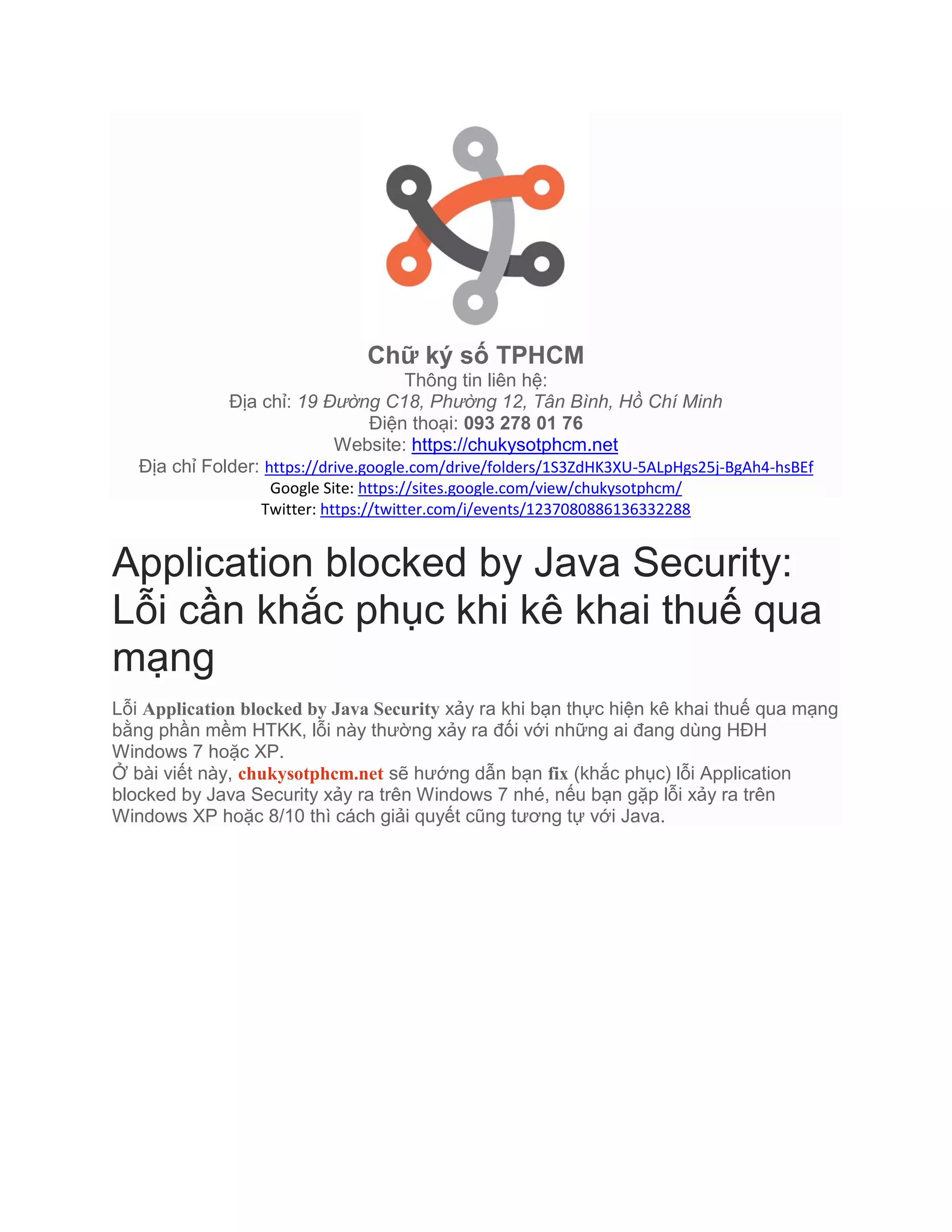 Tài liệu cung cấp hướng dẫn khắc phục lỗi 'application blocked by java security' khi kê khai thuế trực tuyến trên hệ điều hành Windows. Các bước giải quyết bao gồm thay đổi cài đặt trong Control Panel và thêm địa chỉ website kê khai vào danh sách ngoại lệ trong cài đặt Java. Sau khi thực hiện các bước trên, người dùng có thể truy cập và nộp tờ khai thuế bình thường.