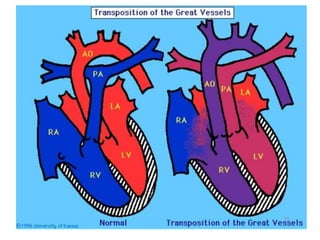 3. TGA accounts for 5-7% of congenital heart defects. It involves the aorta originating from the right ventricle and the pulmonary artery originating from the left ventricle. It requires mixing of blood between the pulmonary and systemic