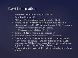 The Winter Formal 2014 will be held at the Rancho Bernardo Inn on February 8th, from 7:00 PM to 11:00 PM, with ticket sales running from January 28th to February 6th, priced at $85-$90 per couple. All attendees must follow a formal dress code that includes specific attire guidelines for both gentlemen and ladies, and off-campus guest passes are limited and due by February 5th. Non-compliance with the dress code may result in barring from entry, and students are encouraged to check attire appropriateness with the dean's office.