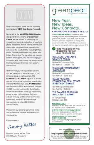 The document summarizes a commercial real estate conference that took place on January 26, 2012 in New York City. The conference included panels on office, retail, finance/investment, and global real estate economics markets. It also promoted upcoming real estate events from the organization GreenPearl Events and thanked attendees of their 2011 events. Additional details were provided on membership benefits for the New York Metro CCIM Chapter.
