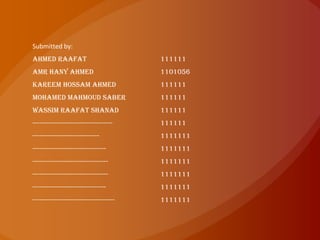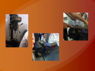 The document is a report on the fabrication of a c-clamp submitted by engineering students at Cairo University. It describes the objective of making the c-clamp to learn manufacturing processes. It then details the processes used, including cutting the raw material to size, drilling a hole, and welding a nut. Dimensions of the finished part are provided. Photos show the different steps of rasping, drilling, and welding. Various welding processes are also defined.