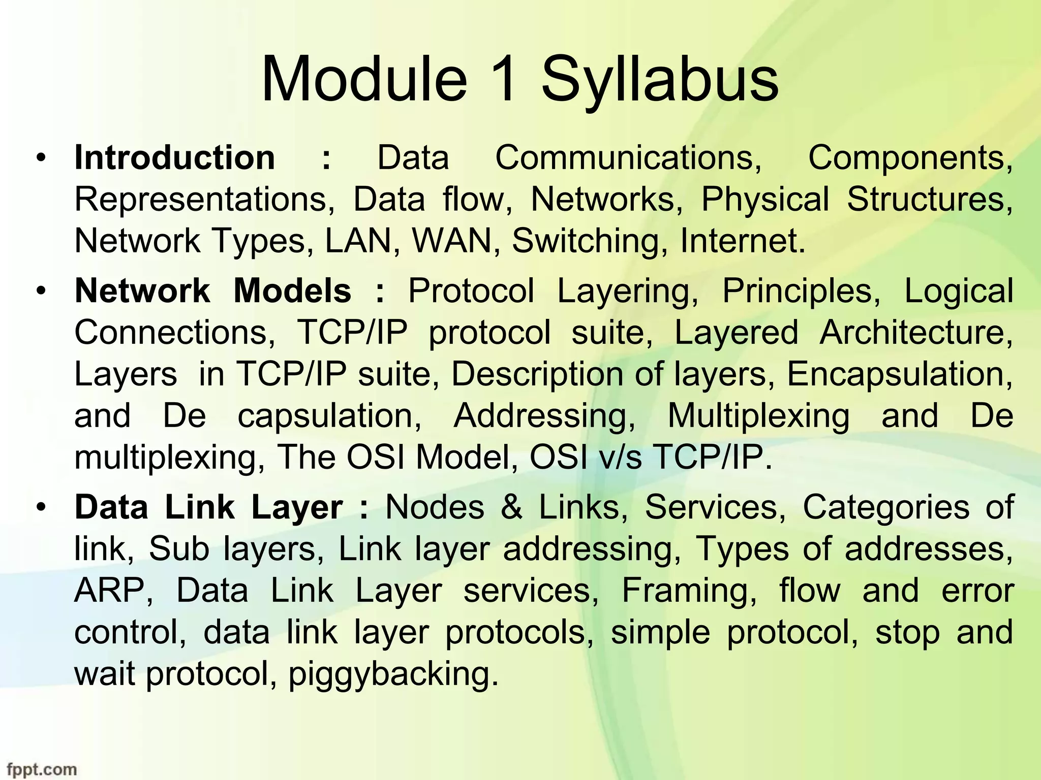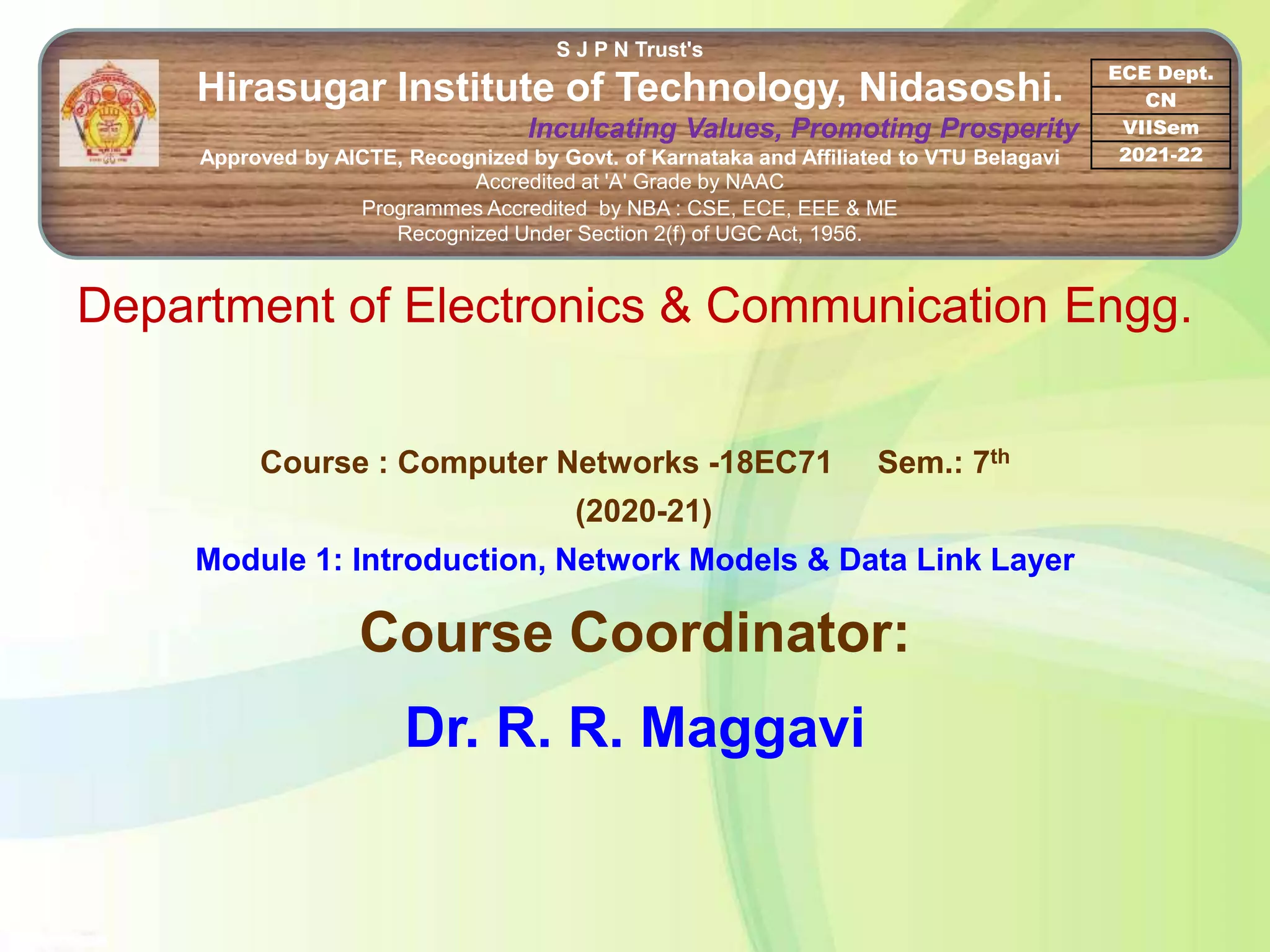 This document provides information about a course on computer networks being offered by the Department of Electronics and Communication Engineering at Hirasugar Institute of Technology. The course is for the 7th semester and covers Module 1 which includes introductions to data communications, network models, and the data link layer. It discusses fundamental characteristics of data communication systems including delivery, accuracy, timeliness, and jitter. It also describes components of data communication systems such as the message, sender, receiver, transmission medium, and protocols. Finally, it covers topics on data representation, data flow in simplex, half-duplex and full-duplex modes, physical structures including connection types and physical topologies.