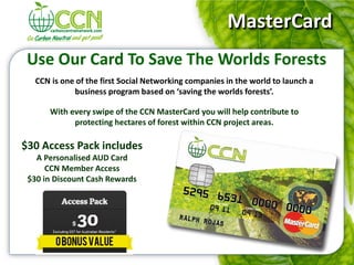 The document outlines the business plan for Carbon Central Network (CCN), a social networking company focused on forest conservation. CCN launches a MasterCard that contributes to protecting hectares of forest for every transaction. Members can choose conservation packs starting at $30 that include forest land and cash rewards. The plan details CCN's income opportunities from sales bonuses, team bonuses, leadership bonuses, and daily bonuses for hectares protected. It provides information on shopping with rewards points and outlines the 5 basic steps to get started as a CCN member.