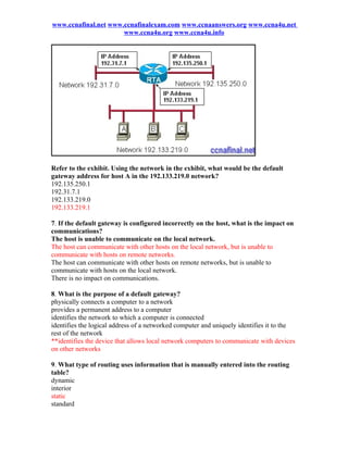 This document contains questions and answers related to CCNA 1 Chapter 5. It includes 21 multiple choice questions about networking concepts like routing, default gateways, broadcast domains, and dynamic versus static routing. It also provides explanations and examples related to using network addresses to forward packets between different interfaces and networks.