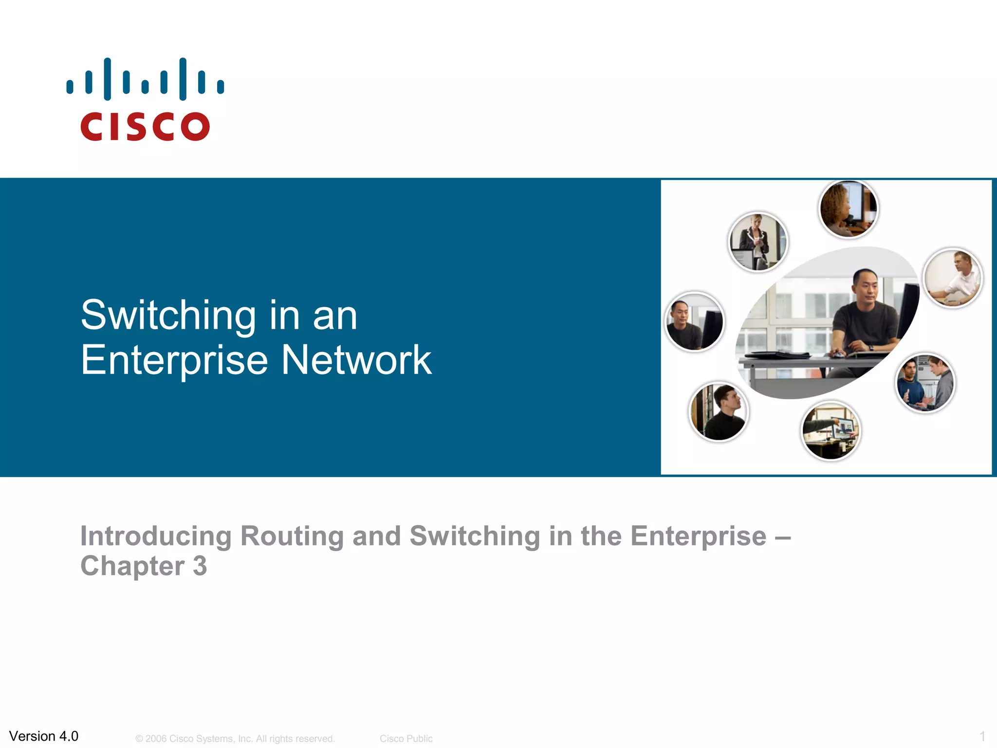 The document discusses switching in enterprise networks. It compares different types of switches used, including hardware-based layer 2 switches and software-based multilayer switches. It explains how spanning tree protocol prevents switching loops by blocking redundant links. It also describes how to configure and maintain VLANs on Cisco switches, including assigning ports, configuring trunking between switches, and using the VLAN Trunking Protocol to manage VLANs across the network. Inter-VLAN routing is enabled using a layer 3 device with subinterfaces.