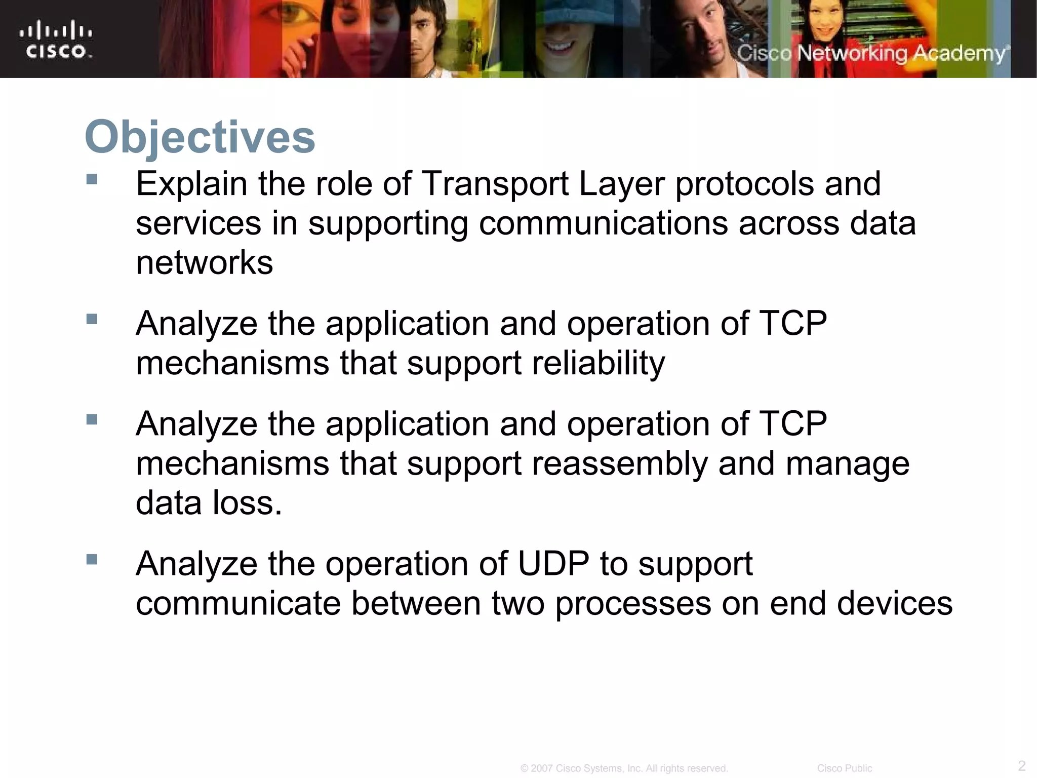 This document discusses the transport layer of the OSI model and protocols TCP and UDP. It aims to explain the role of transport layer protocols in supporting reliable and unreliable communications across networks. TCP provides reliable, connection-oriented communications using mechanisms like port numbers, sequencing, acknowledgments and retransmissions to ensure reliable data delivery. UDP provides simpler, connectionless delivery of datagrams and is best suited for real-time delivery when reliability is less important. The document will analyze how these protocols operate and manage sessions and data transmission.