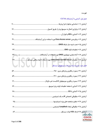 This document is a Persian translation of a CCNA lab manual. It contains an introduction chapter about familiarizing with CCNA labs. It then has several chapters on basic router and switch management, and basic security configurations on Cisco devices. Each chapter contains multiple lab exercises with step-by-step instructions on topics like password recovery, IOS upgrades, interface configurations, access lists, AAA authentication, SSH, syslog server connections, and more.