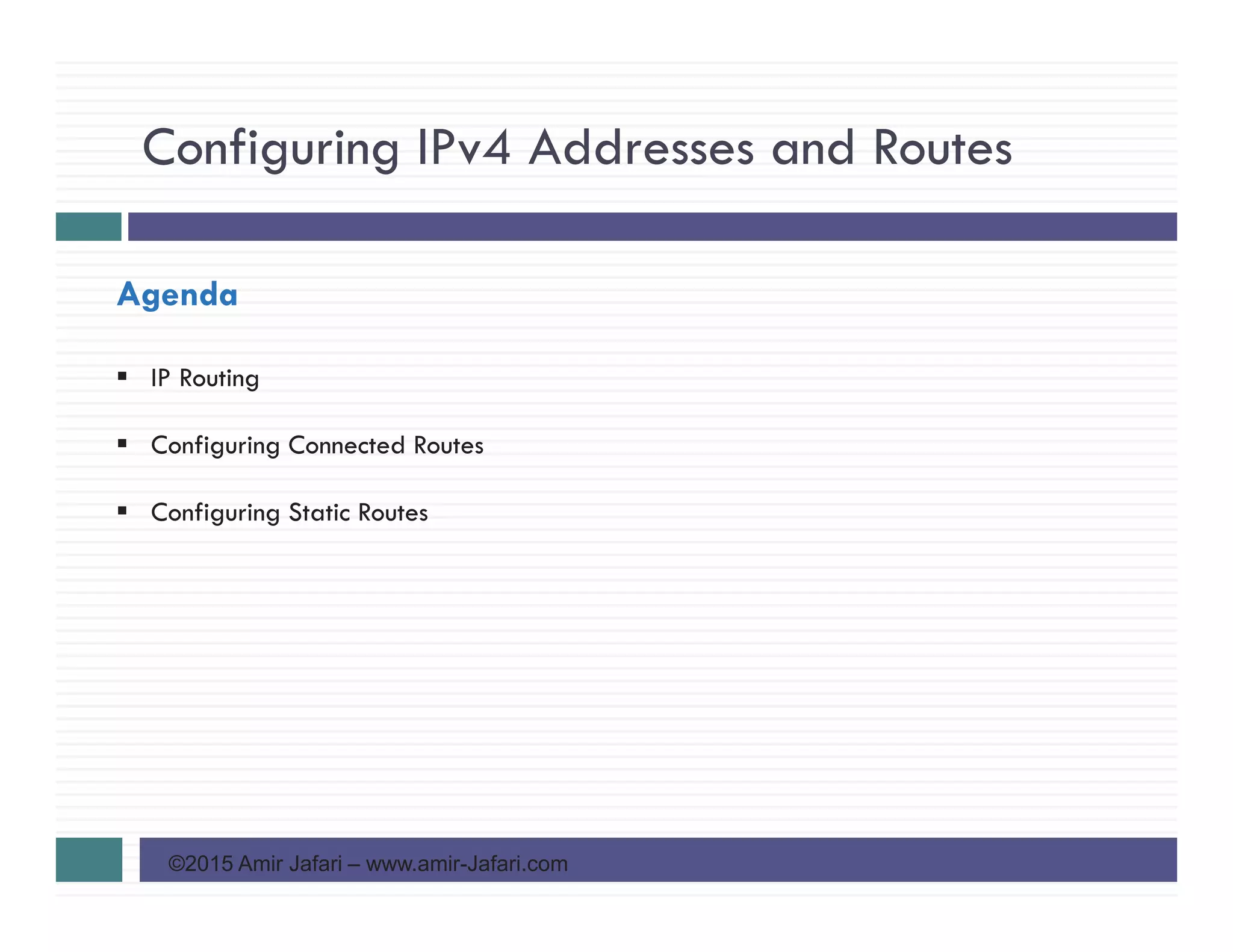 This document discusses configuring IPv4 addresses and routes on routers. It covers: