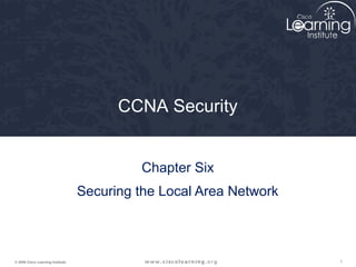 This document provides an overview of securing the local area network (LAN) as covered in Chapter Six of the CCNA Security curriculum. It outlines the major concepts like endpoint vulnerabilities and protection methods, switch security features like port security and storm control. The objectives are to describe how to configure technologies like Cisco IronPort, Cisco NAC, and the Cisco Security Agent to ensure endpoint security and how to secure the Layer 2 infrastructure by mitigating attacks. Areas of focus include securing endpoints, the network infrastructure, and advanced technologies like wireless, VoIP and storage area networks.