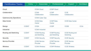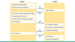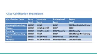 The document provides information about CCNA training and certification. It discusses the topics covered in the CCNA exam, recommended training courses, study materials, exam format and structure. The CCNA certification tests knowledge of network fundamentals, switching, routing, WAN technologies, security and management. Exams last 90 minutes and contain around 50-60 multiple choice and simulation questions. Common jobs requiring the CCNA include network administrator, database administrator and help desk technician.