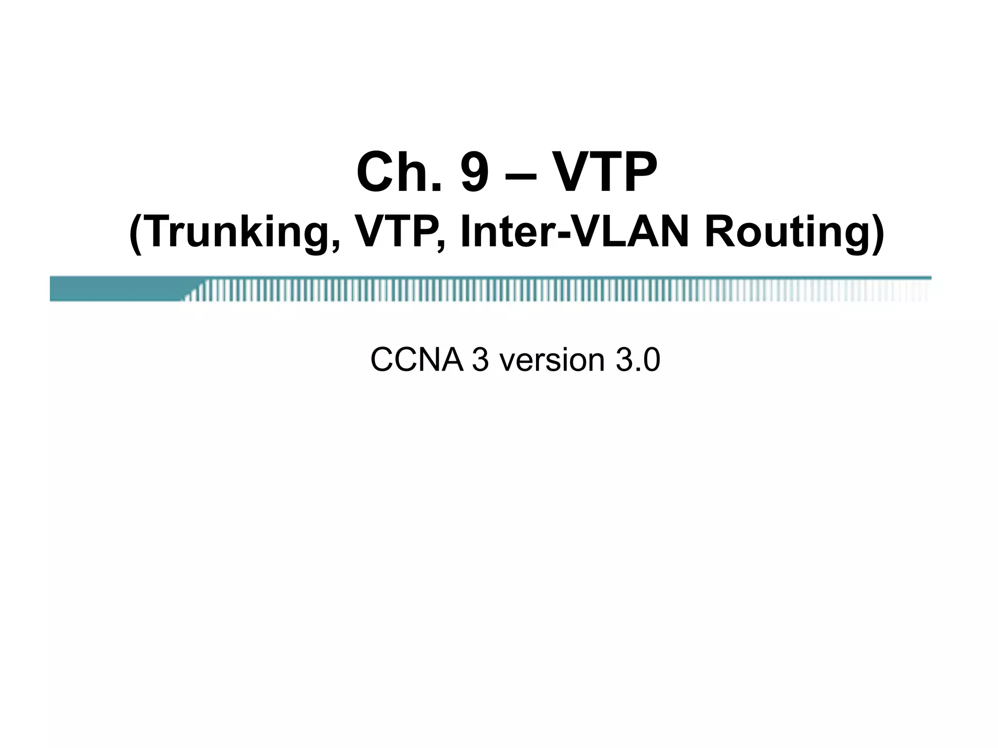 - VLAN Trunking Protocol (VTP) allows VLAN configurations to be consistently maintained across a common administrative domain to reduce complexity and inconsistencies when changes are made. VTP advertisements containing VLAN information are transmitted over trunk links and switches inherit the sending switch's VTP domain name. VTP uses revision numbers, starting at 0 and incrementing with each change, to determine if received information is more recent than the local configuration.