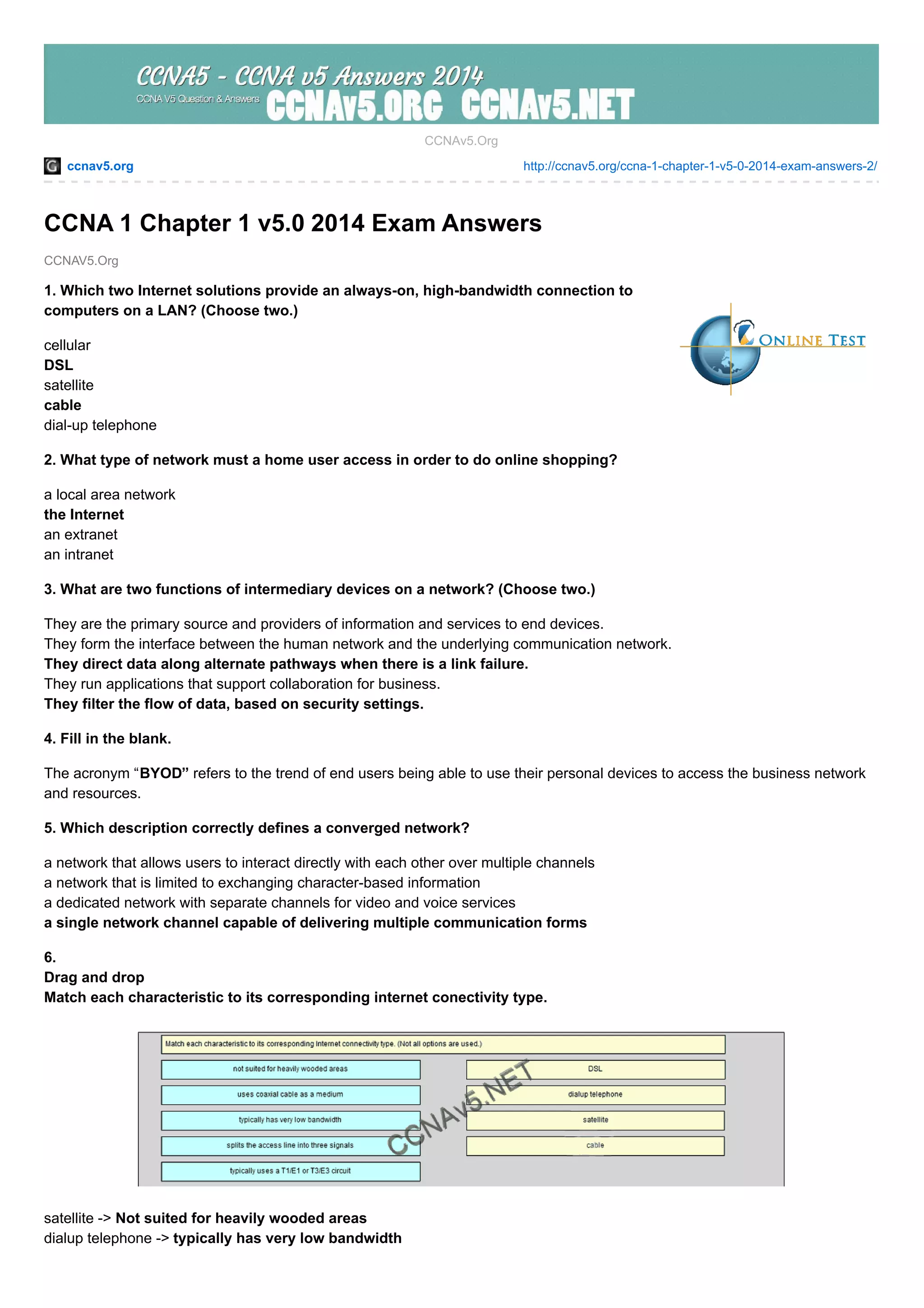 This document provides the questions and answers to an exam on CCNA 1 Chapter 1. It tests knowledge of networking fundamentals like different types of Internet connections, functions of intermediary devices, definitions of basic networking terms, security goals, and factors considered when selecting network media. The exam also covers concepts like cloud computing, characteristics of circuit-switched networks, tools that enable remote meetings, and the relationship between LANs and WANs.
