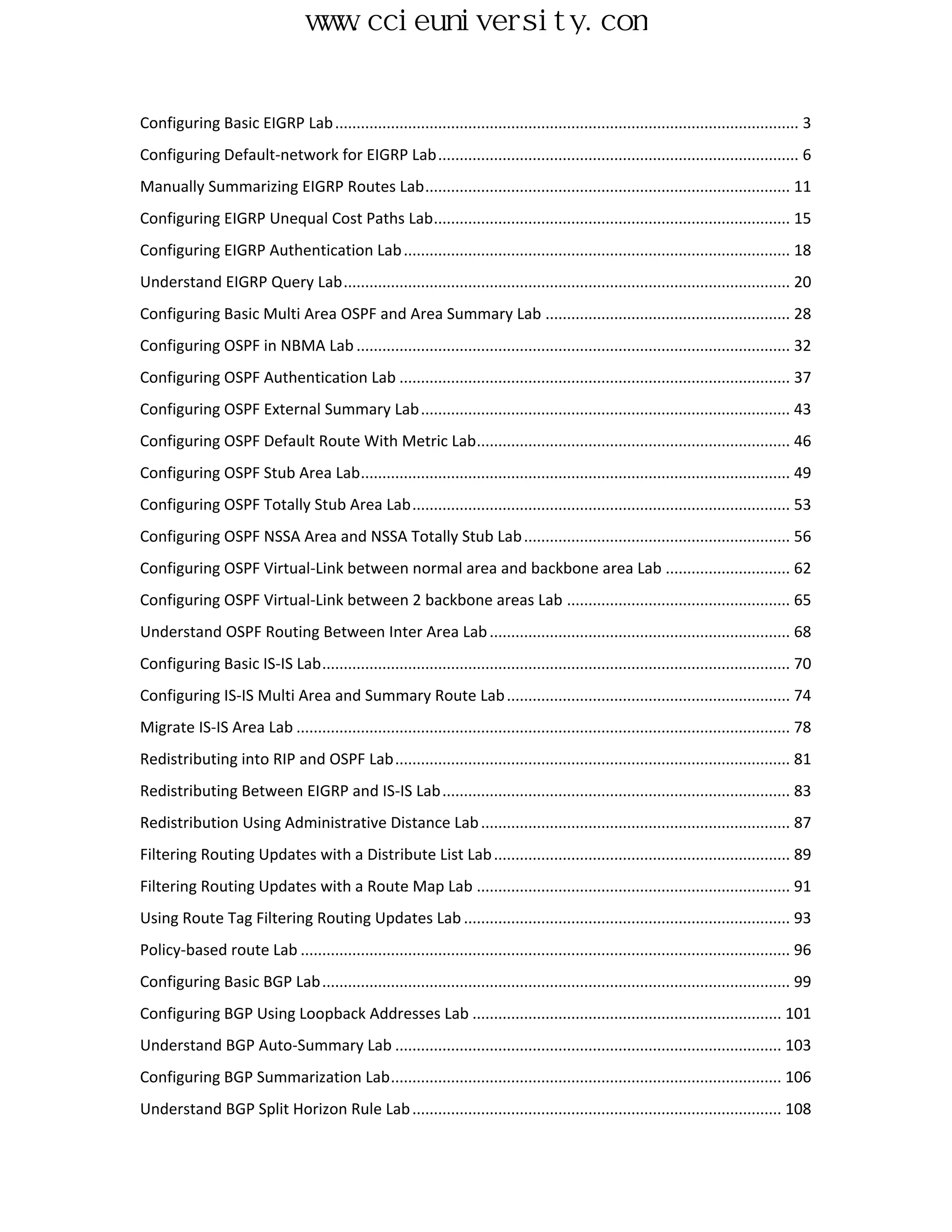 The document describes several EIGRP and OSPF configuration labs focused on routing protocols, including configuring EIGRP parameters like default networks, authentication, and route summarization, as well as OSPF labs on areas, route types, and virtual links. The labs provide instructions for common routing tasks to help readers master EIGRP and OSPF configurations.