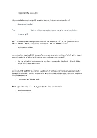 Dual-homed connectivity provides connectivity to the internet through two separate internet service providers (ISPs), reducing the risk of an outage due to single point of failure if one ISP fails. The ipv6 traffic-filter command is used to apply an IPv6 access list called MY-LIST to check inbound packets on an interface. NAT64 is the protocol that provides IPv4 internet connectivity to IPv6 devices.