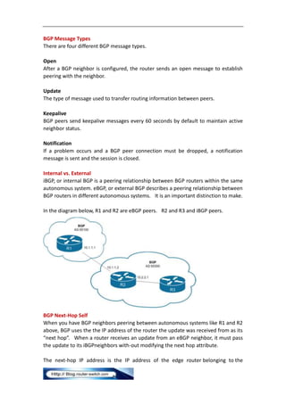 BGP is an external routing protocol used between autonomous systems to exchange routing and reachability information. It uses path vector attributes and autonomous system numbers to prevent routing loops and make routing decisions based on attributes like local preference, weight, and MED. BGP configuration involves enabling BGP on the router, establishing neighbor relationships, defining networks to advertise, and controlling path selection using attributes and route maps.