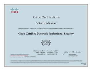 John Chambers, Chairman and CEO of Cisco Systems, Inc., has issued a certificate validating that Sotir Radevski has successfully completed the requirements to become a Cisco Certified Network Professional Security. The certificate is valid through November 8, 2016 and lists Sotir Radevski's Cisco ID number for verification on the Cisco website.