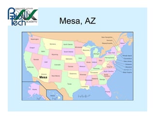 The document summarizes biotechnology programs in Arizona high schools, including the Mesa Public Schools Biotechnology Academy. The Academy is a 4-year program that provides students with skills to transition to post-secondary education or careers in bioscience. Students conduct genomics research projects sequencing bacterial genomes and identifying gene functions. The Academy partners with local colleges and research institutions to provide authentic experiences for students.