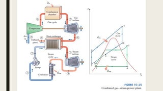 The document discusses combined cycle power plants (CCPPs), focusing on the integration of gas and steam power cycles. It explains the roles of the topping cycle, which provides exhaust heat, and the bottoming cycle, which utilizes that heat. CCPPs are noted for achieving high thermal efficiencies through this combined approach.